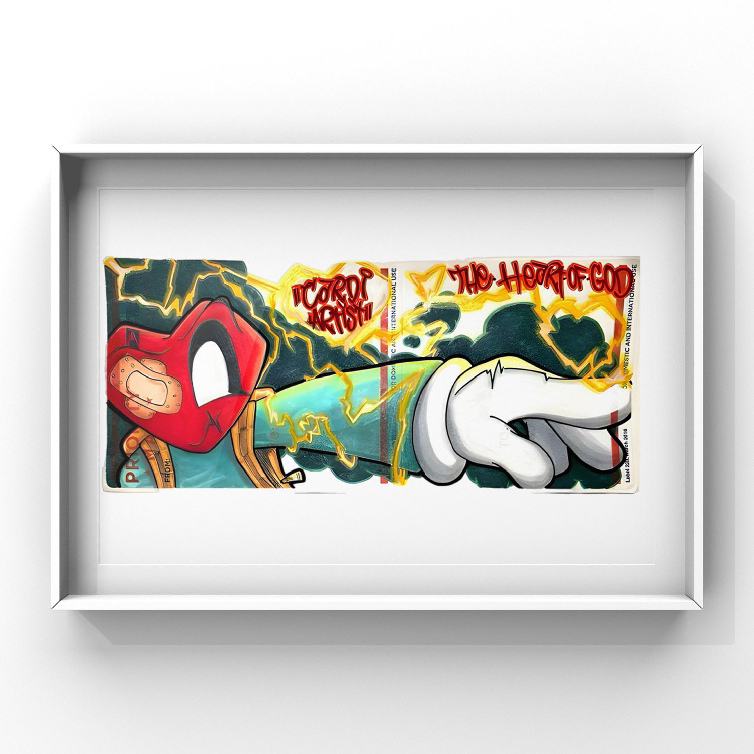 CardiArtist stands as a God-like figure, crackling with divine energy — one of his superpowers fueled by a bionic pacemaker that keeps his heart beating strong. The bold strokes and vibrant colors breathe life into this tribute, symbolizing the power of art not only as expression but as a tool for raising heart health awareness.